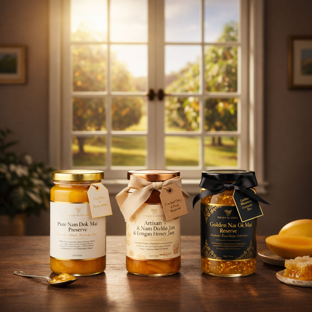 A limited-edition, handcrafted preserve marrying the lusciousness of ripe Nam Dok Mai mangoes with the rich, aromatic sweetness of pure Thai Longan Honey. A truly authentic taste of Thailand's seasonal bounty.