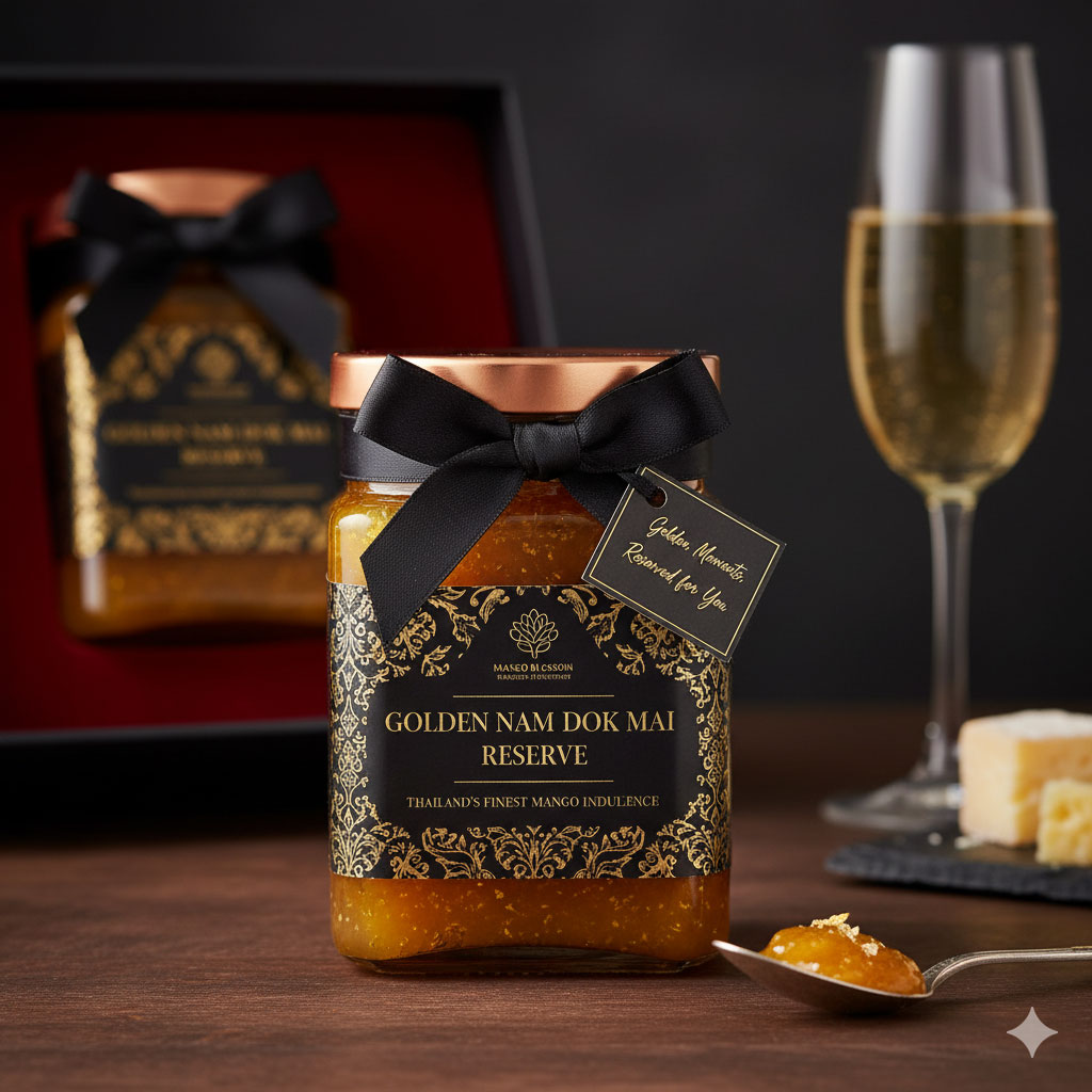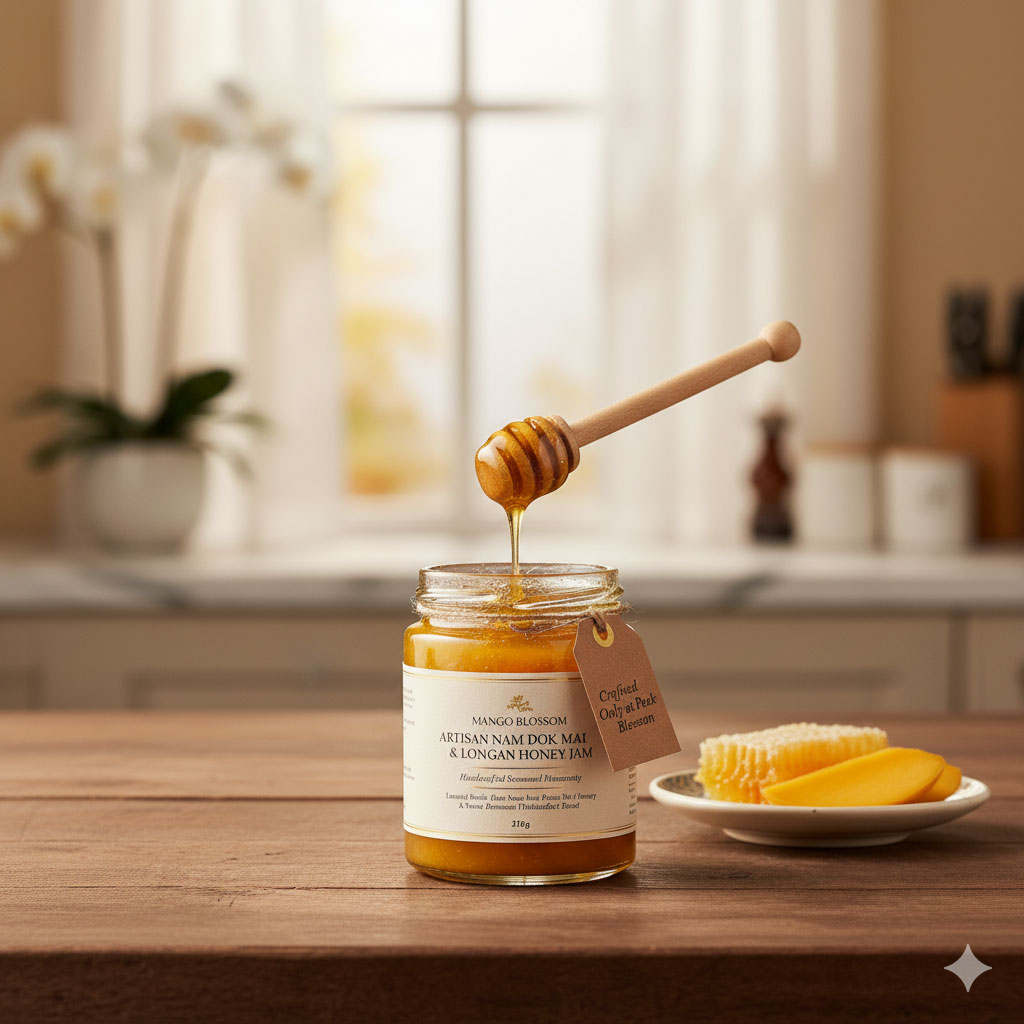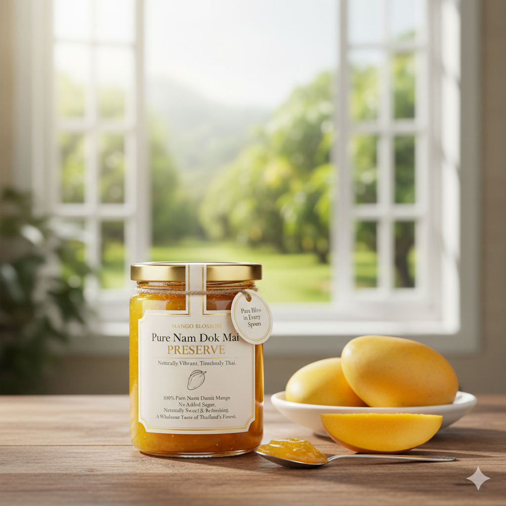 A limited-edition, handcrafted preserve marrying the lusciousness of ripe Nam Dok Mai mangoes with the rich, aromatic sweetness of pure Thai Longan Honey. A truly authentic taste of Thailand's seasonal bounty.